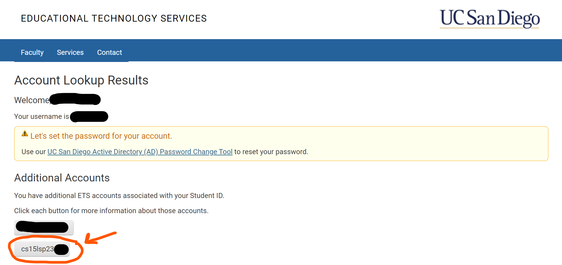 If not, then you can find your course-specific account at https://sdacs.ucsd.edu/~icc/index.php. Enter in your username and PID and you should see a page that shows your CSE 15L account: