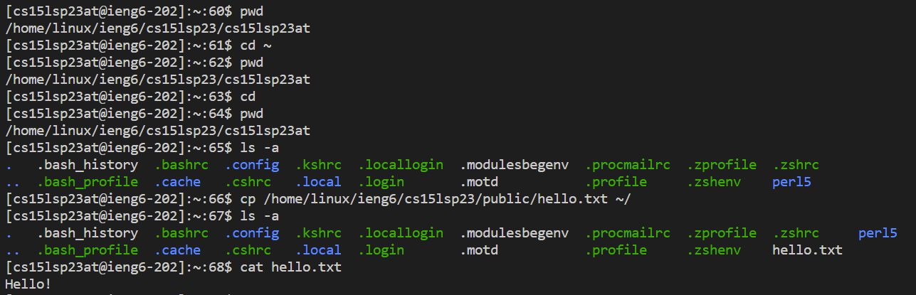 cp /home/linux/ieng6/cs15lsp23/public/hello.txt ~/ copied the public hello.txt file to my home directory, which was confirmed through ls -acat: prints out the contents of a given file