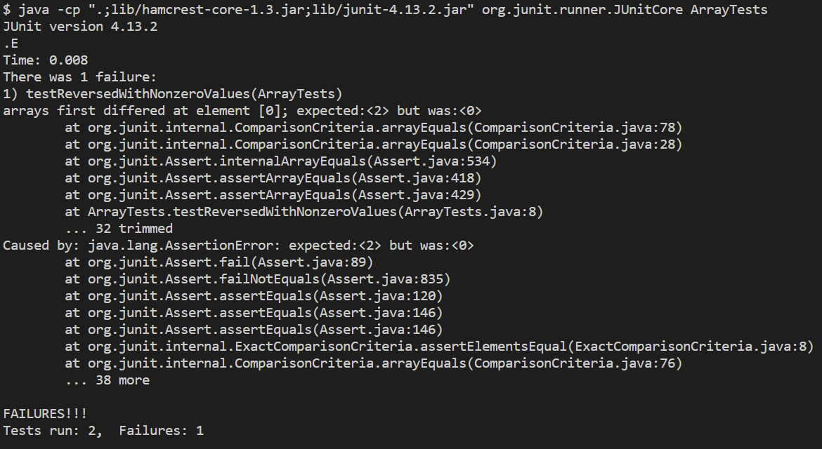 testReversedWithDefaultValues, which was our non-failure-inducing input. And as expected, a failure did occur for our failure-inducing input, testReversedWithNonzeroValues.{1, 2}, the first element of the reversed array was expected to be 2; however, the actual output from the reversed method was the default integer array value of 0I also went ahead and fixed the reversed method, and here’s the before-and-after of the change.